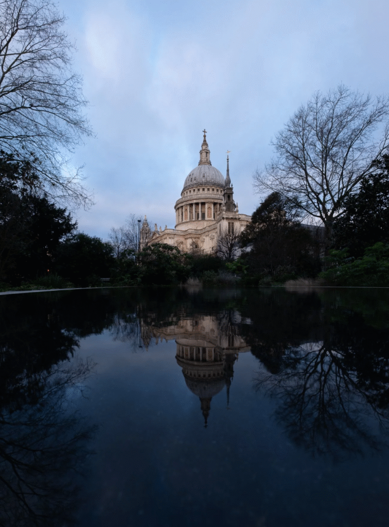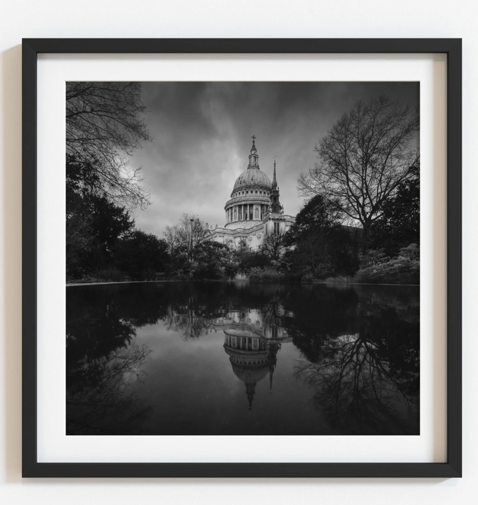 The raw file for Dual Realms is a 3:2 vertical shot of St Paul’s Cathedral, captured in winter, which explains the bare trees. I shoot vertically to allow cropping flexibility, particularly when converting to square format. This approach gives me control over the composition, letting me adjust how much sky or reflection appears in the final image.